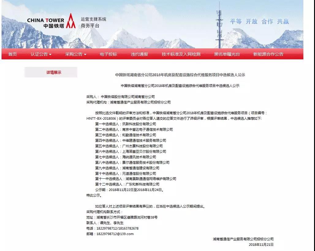 《中國(guó)鐵塔湖南省分公司2018年機(jī)房及配套設(shè)施綜合代維服務(wù)》項(xiàng)目于2018年11月20日在湖南長(zhǎng)沙開標(biāo),經(jīng)評(píng)標(biāo)委員會(huì)及專家評(píng)審,航天通信所屬南京中富達(dá)在眾多競(jìng)爭(zhēng)對(duì)手中脫穎而出,中標(biāo)第二份額標(biāo)包。此次標(biāo)的為2019年至2021年中國(guó)鐵塔湖南分公司機(jī)房及配套項(xiàng)目綜合代維服務(wù),為期三年。