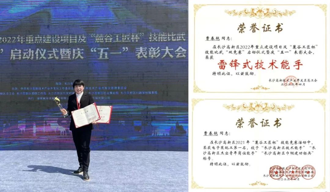 表彰大會上,湖南捷誠職工曹春艷被授予“雷鋒式技術(shù)能手”稱號。同時,被授予“長沙高新區(qū)技術(shù)能手”“長沙高新區(qū)杰出青年崗位能手”“長沙高新區(qū)巾幗建功標(biāo)兵”等稱號。